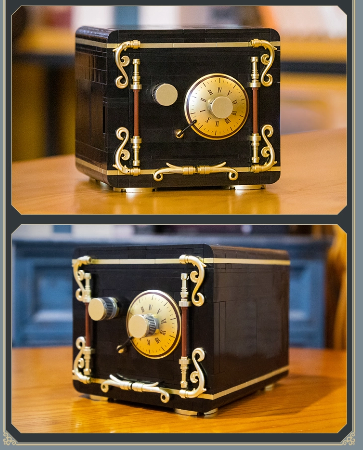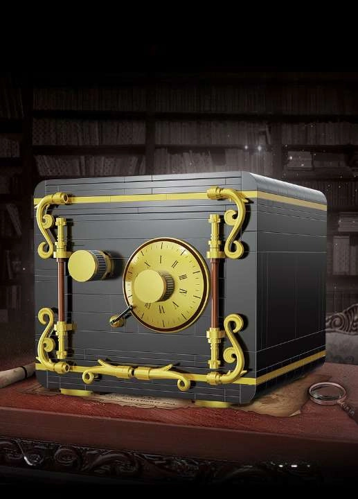 Sejf utrzymany jest w czerni ze złotymi akcentami, główne pokrętło z cyframi rzymskimi ułatwia ustawianie kodu, a autentyczny klikający dźwięk podczas obracania zwiększa realizm. Zestaw wspiera koordynację ręka–oko, kreatywność i cierpliwość, a dzięki kompatybilności elementów łatwo go rozszerzysz o inne modele.
