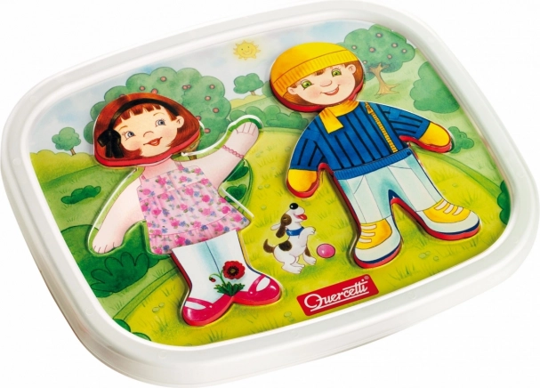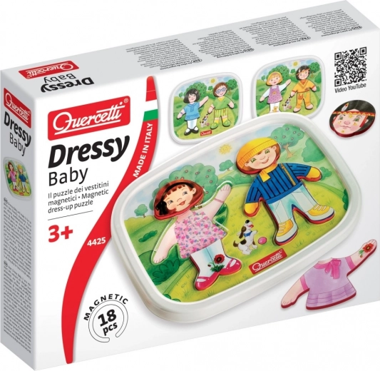 Odkryj zabawną magnetyczną układankę QUERCETTI Dressy Baby dla dzieci od 3 lat, która rozwija kreatywność, motorykę małą oraz koordynację oko–ręka. Dzieci mogą łatwo łączyć stroje na dwóch postaciach dzięki silnym magnesom, a wszystko schować do praktycznego zamykanego pudełka do wygodnego przechowywania i przenoszenia.