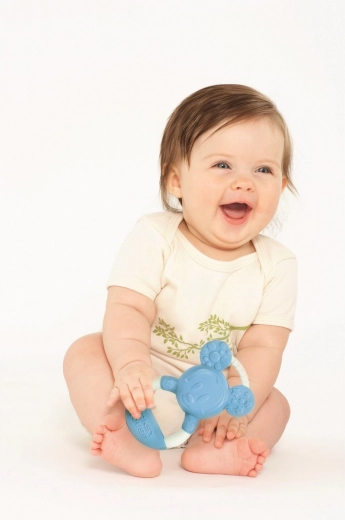Teksturowana powierzchnia gryzaka wspiera percepcję sensoryczną oraz rozwój małej motoryki. Ergonomiczny kształt z pewnym chwytem zachęca dziecko do samodzielnego trzymania i bezpiecznego eksplorowania.