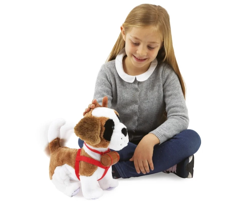Miękka sierść, czerwone szelki i obroża z charakterystyczną baryłką nadają zabawie realistyczny, ratowniczy charakter i pobudzają wyobraźnię.