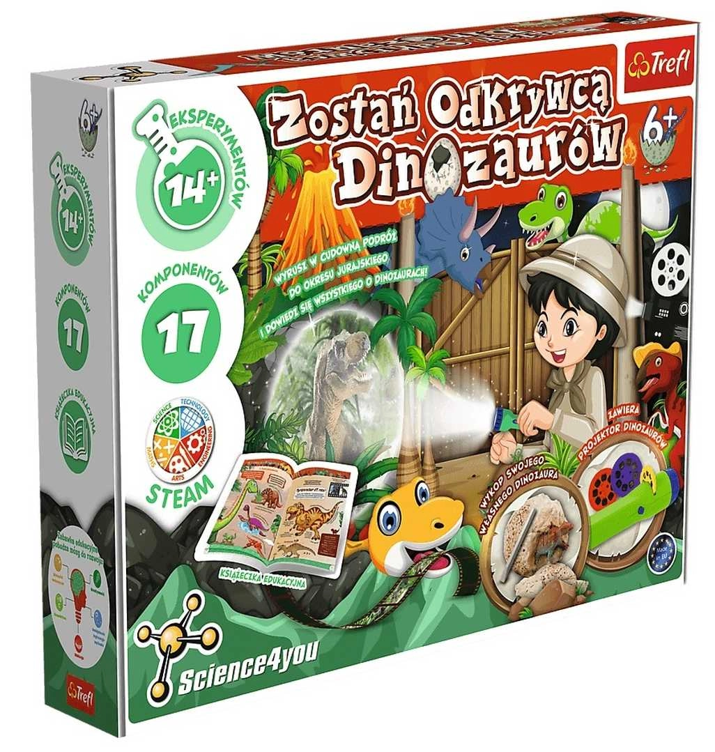 Podczas eksperymentów dzieci rozwijają zdolności manualne, kreatywność, cierpliwość oraz umiejętność rozwiązywania problemów. Dzięki projektorowi z 24 slajdami dinozaurów nauka staje się jeszcze ciekawsza — wyświetlaj ulubione gatunki na ścianie i stwórz w domu małe laboratorium dinozaurów.