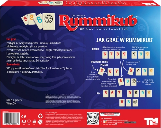 Zawartość pudełka: 106 płytek (8 zestawów liczb od 1 do 13 w czterech kolorach oraz 2 jokery), 4 stojaki i szczegółowa instrukcja. Przygotuj się na emocjonujące pojedynki, w których liczy się sprytna taktyka i właściwe wyczucie czasu.