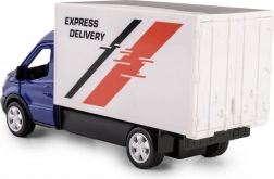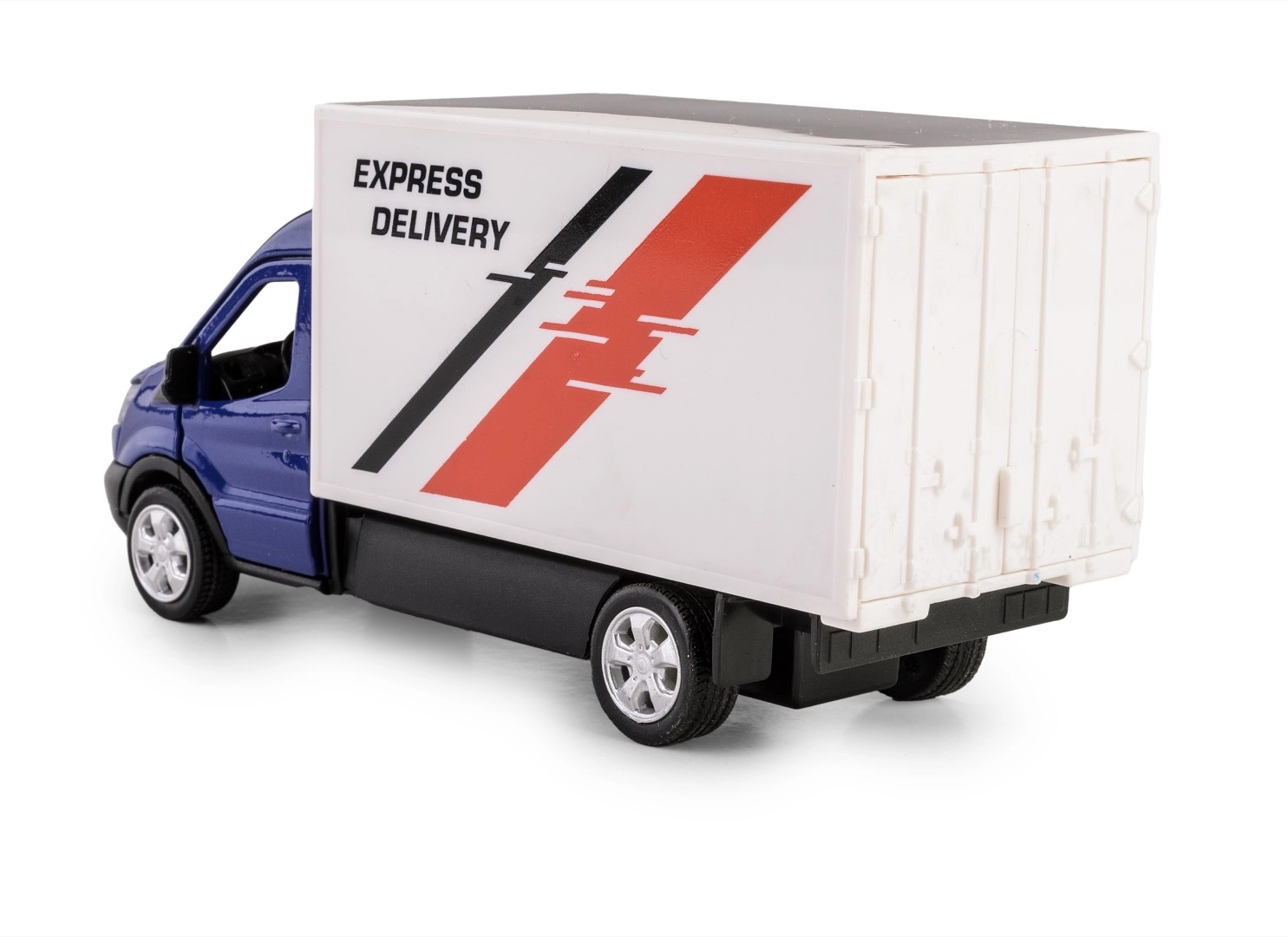 Dzięki otwieranym drzwiom zajrzysz do wnętrza, a mechanizm pull-back po naciągnięciu wystrzeli auto do przodu. Realistyczny wygląd podkreślają niebieski lakier, srebrne koła i wyrazisty nadruk Express Delivery.