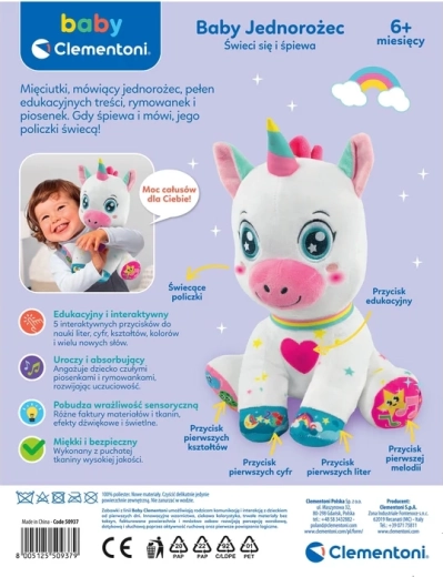 Uroczy interaktywny jednorożec marki BABY CLEMENTONI ucieszy dzieci od 6 miesięcy. Posiada 5 dotykowych przycisków na łapkach i serduszku, które uruchamiają dźwięki, piosenki i rymowanki oraz uczą liter, liczb, kształtów i kolorów. Miękkie, nietoksyczne materiały, podświetlane buźki i świecący róg wspierają percepcję wzrokową, małą motorykę i rozwój słownictwa.