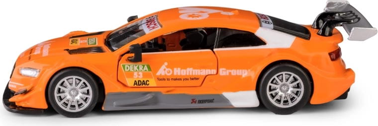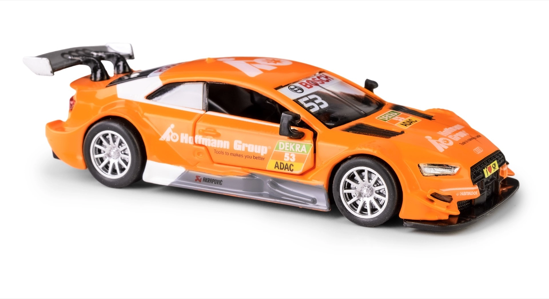 Ciesz się detaliczną repliką wyścigowego auta AUDI RS 5 DTM w kompaktowej skali 1:43. Model w intensywnie pomarańczowym kolorze łączy realistyczny wygląd z praktycznymi funkcjami, które ucieszą dzieci i dorosłych. Otwierane drzwi odsłaniają starannie wykonane wnętrze, a gumowe opony zapewniają doskonałą stabilność w trakcie jazdy.