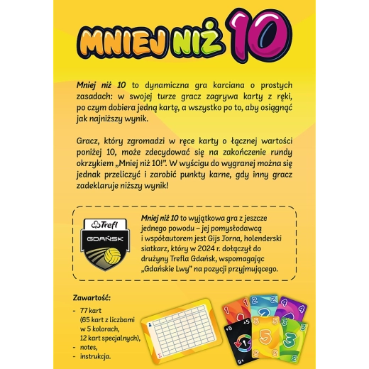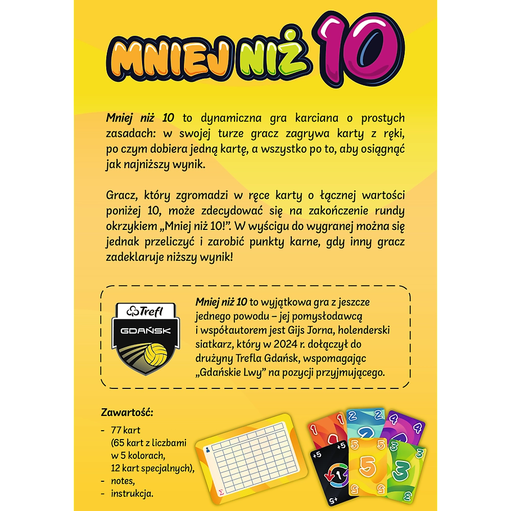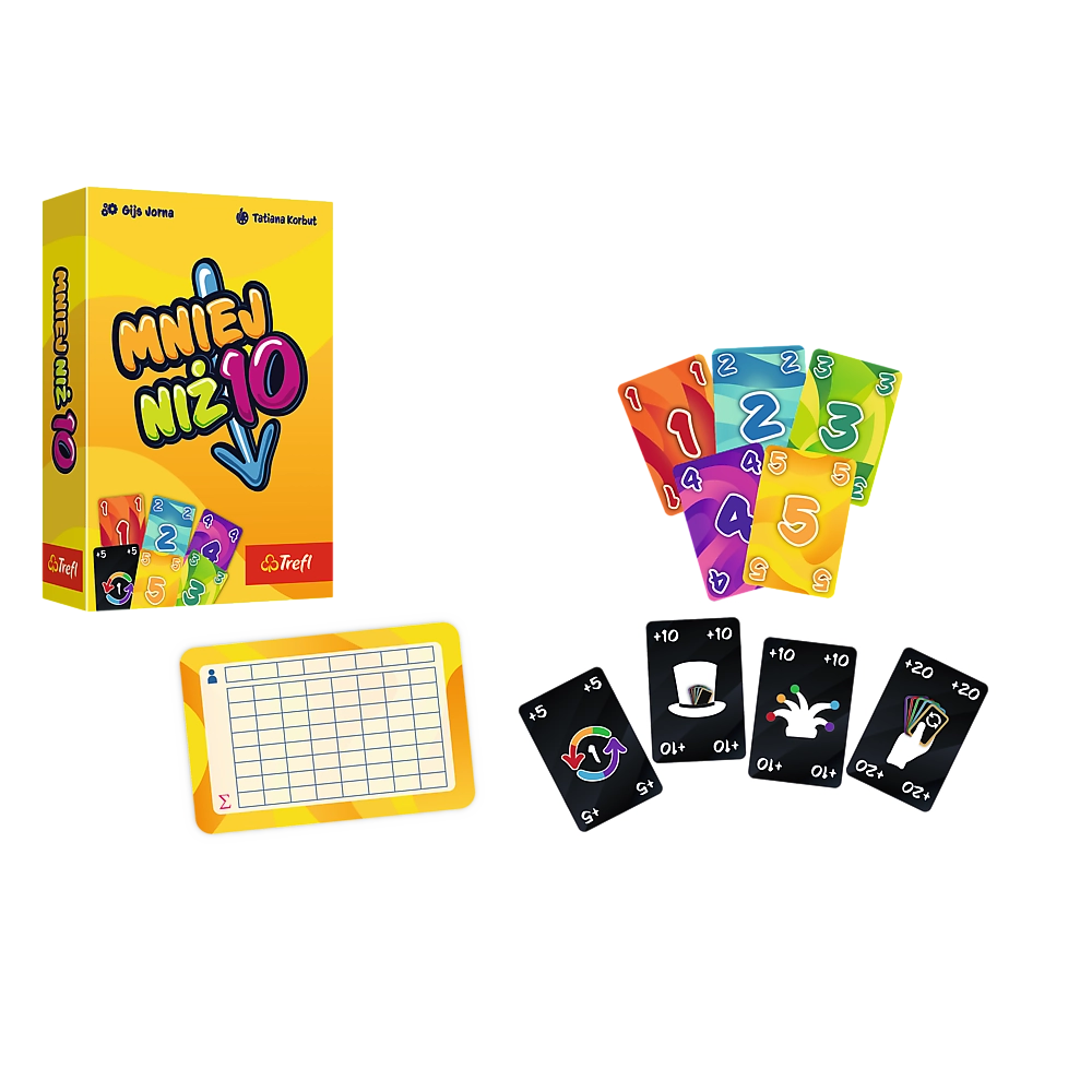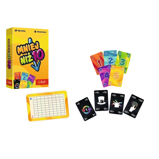 Szybka i emocjonująca gra karciana, w której starasz się mieć w ręce jak najniższą sumę punktów – najlepiej mniej niż dziesięć. Gracze wykonują tury na zmianę, zagrywają karty lub ich kombinacje i dobierają nowe, aby obniżyć swój wynik. Gdy ktoś osiągnie mniej niż 10 punktów, może zakończyć rundę okrzykiem „Mniej niż 10!”. Wygrywa ten, kto ma rzeczywiście najniższą sumę, pozostali otrzymują punkty karne. Idealna dla 2–8 graczy, od 8 lat, czas rozgrywki około 20 minut – świetna w domu i w podróży.