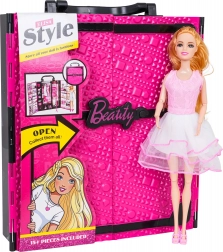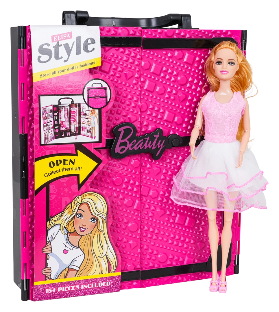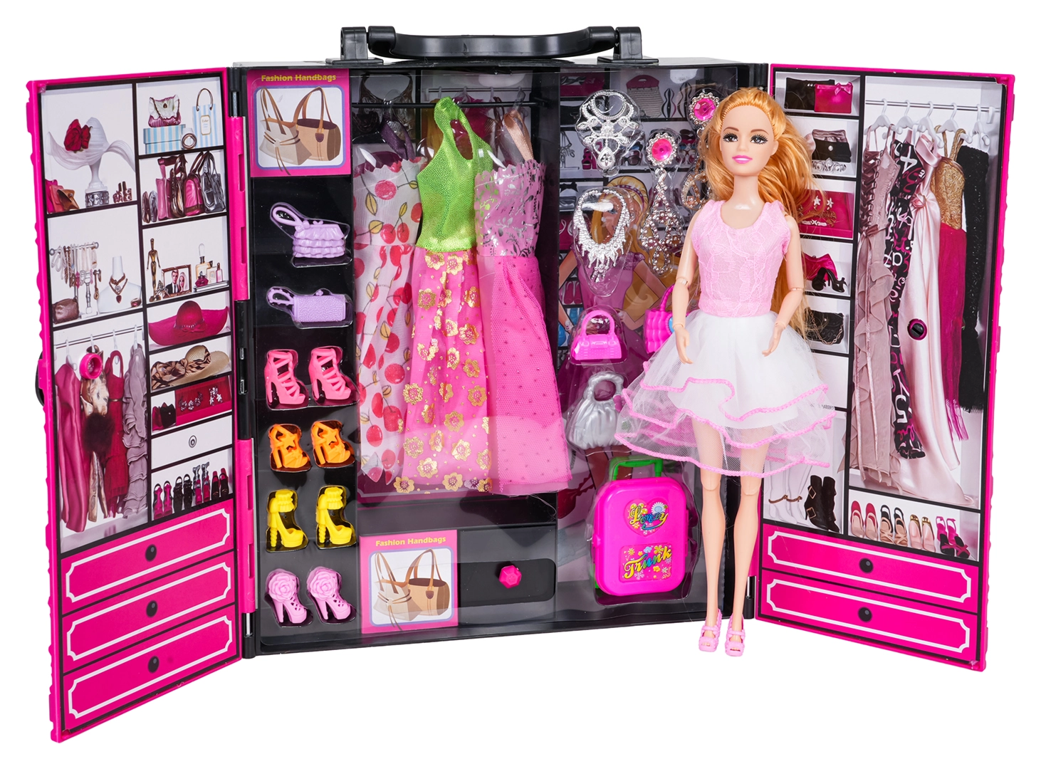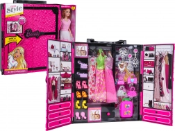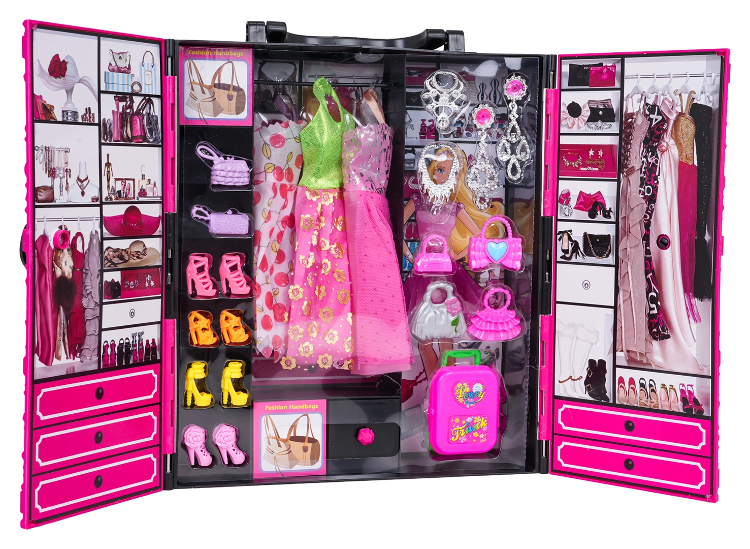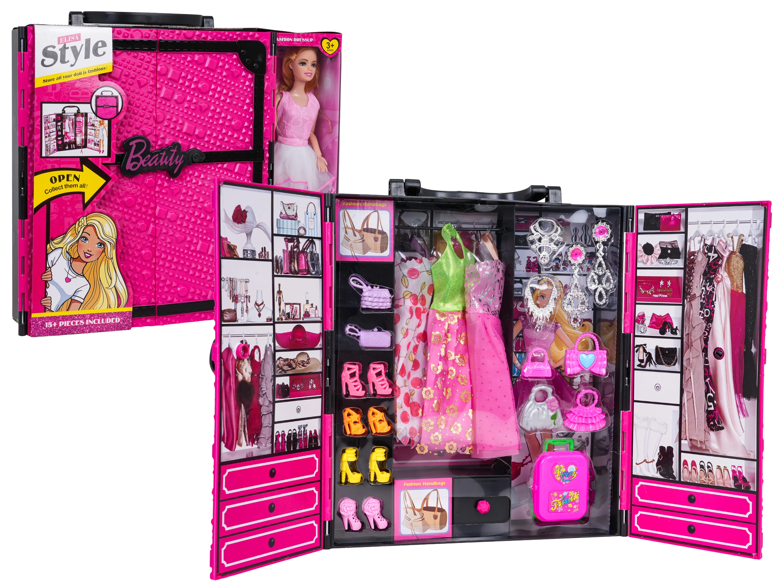 Ten bogato wyposażony zestaw łączy dużą przenośną garderobę i stylową lalkę w pięknej sukni. W środku znajdziesz sukienki, buty na obcasie, torebki, biżuterię i inne dodatki uporządkowane na półeczkach, w szufladkach i na wieszakach. Dzieci mogą cieszyć się ubieraniem, zabawą fabularną i ćwiczyć motorykę małą.