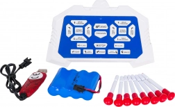 W zestawie znajduje się akumulator 4,8 V 700 mAh Ni-Cd z ładowaniem przez USB oraz 8 strzałek z przyssawkami. Robot porusza się do przodu i do tyłu, skręca w prawo i w lewo, potrafi się ślizgać i wykonać obrót o 360°. Strzałki mają zasięg około 5 m. Tryb DEMO pokazuje wszystkie możliwości jednym przyciskiem, a wielostopniowa regulacja głośności zapewnia komfort w domu i na zewnątrz.