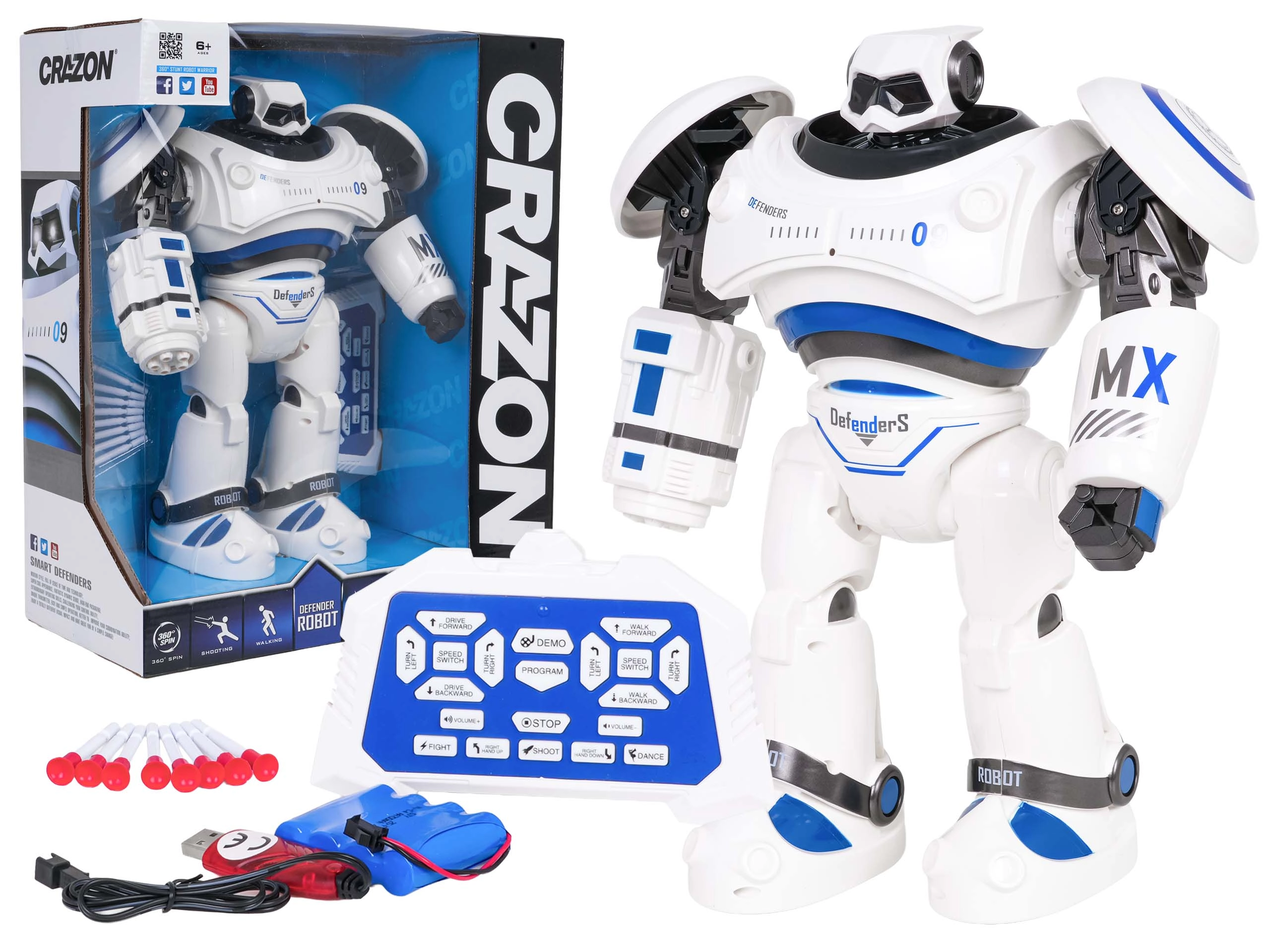 W zestawie 8 nabojów z przyssawką. Robot wystrzeliwuje strzałki o zasięgu ok. 5 m – bezpieczna i wciągająca zabawa dla dzieci.