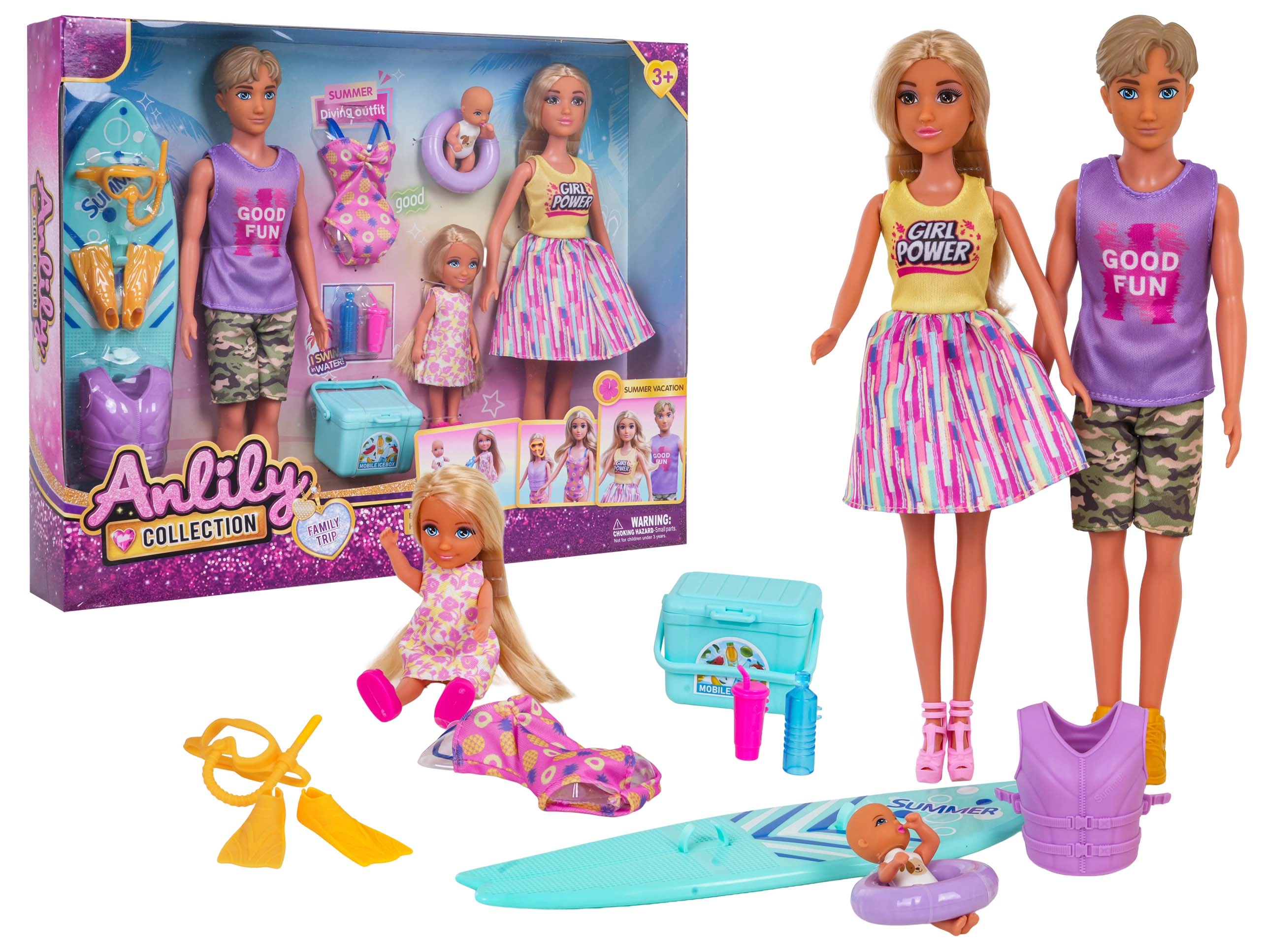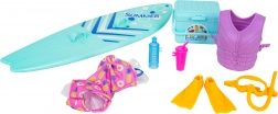 4 lalki (mama, tata, córka, niemowlę), deska surfingowa, kamizelka ratunkowa, płetwy, maska/zestaw tlenowy, stroje kąpielowe, lodówka turystyczna, 2 butelki/kubeczki na napoje, koło do pływania