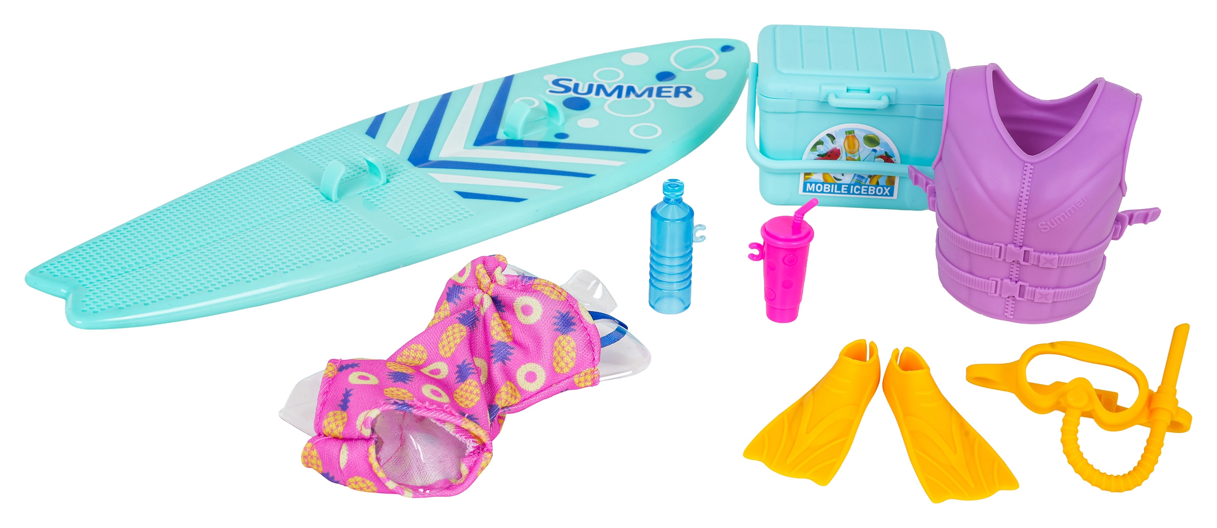Dzięki desce surfingowej, płetwom, kamizelce ratunkowej i dmuchanemu kołu dzieci mogą tworzyć niezliczone historie – od surfowania po bezpieczne kąpiele. Lodówka na napoje i kubeczki dopełnią każdą plażową przygodę. Lalki mają ruchome ręce, nogi i głowę i można je łatwo posadzić lub postawić, by tworzyć realistyczne scenki.