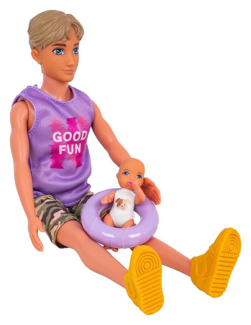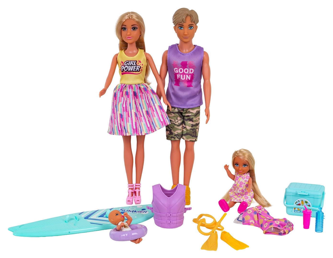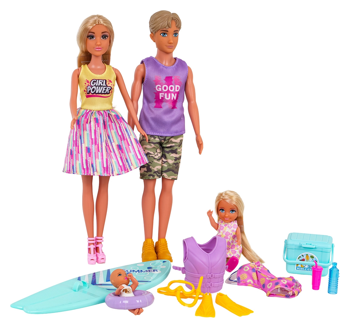 Ciesz się letnią przygodą z tym rodzinnym plażowym zestawem – mama, tata, córka i niemowlę oraz mnóstwo akcesoriów do surfowania i pływania. W zestawie m.in. deska surfingowa, kamizelka ratunkowa, płetwy, koło i lodówka na napoje. Lalki mają ruchome kończyny i łatwo się przebierają, dzięki czemu zestaw jest idealny do kreatywnej zabawy w odgrywanie ról, rozwijania wyobraźni i długich godzin zabawy.