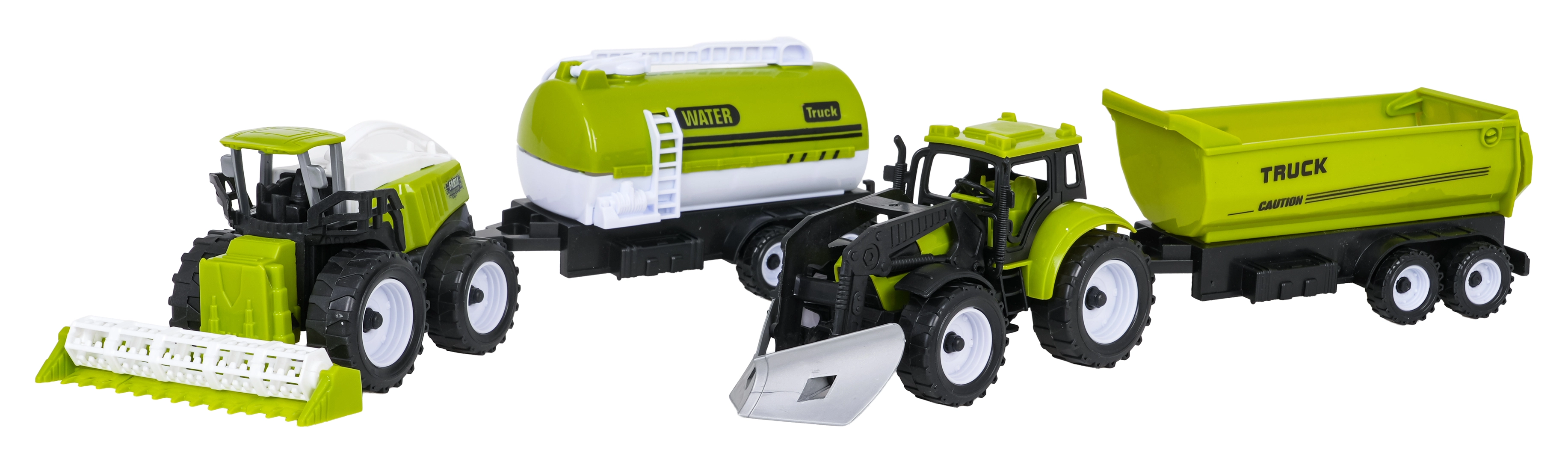 Traktor z pługiem, kombajn, przyczepa i cysterna. Wszystko można ze sobą łączyć, aby tworzyć jeszcze więcej scenariuszy zabawy.
