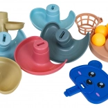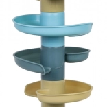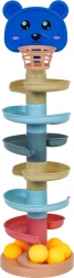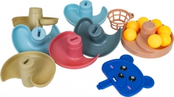 Piłeczki płynnie zjeżdżają przez kilka pięter, a dzieci śledzą ich ruch od koszyczka aż do podstawy zbiorczej. Świetna aktywność wzrokowo‑ruchowa.
