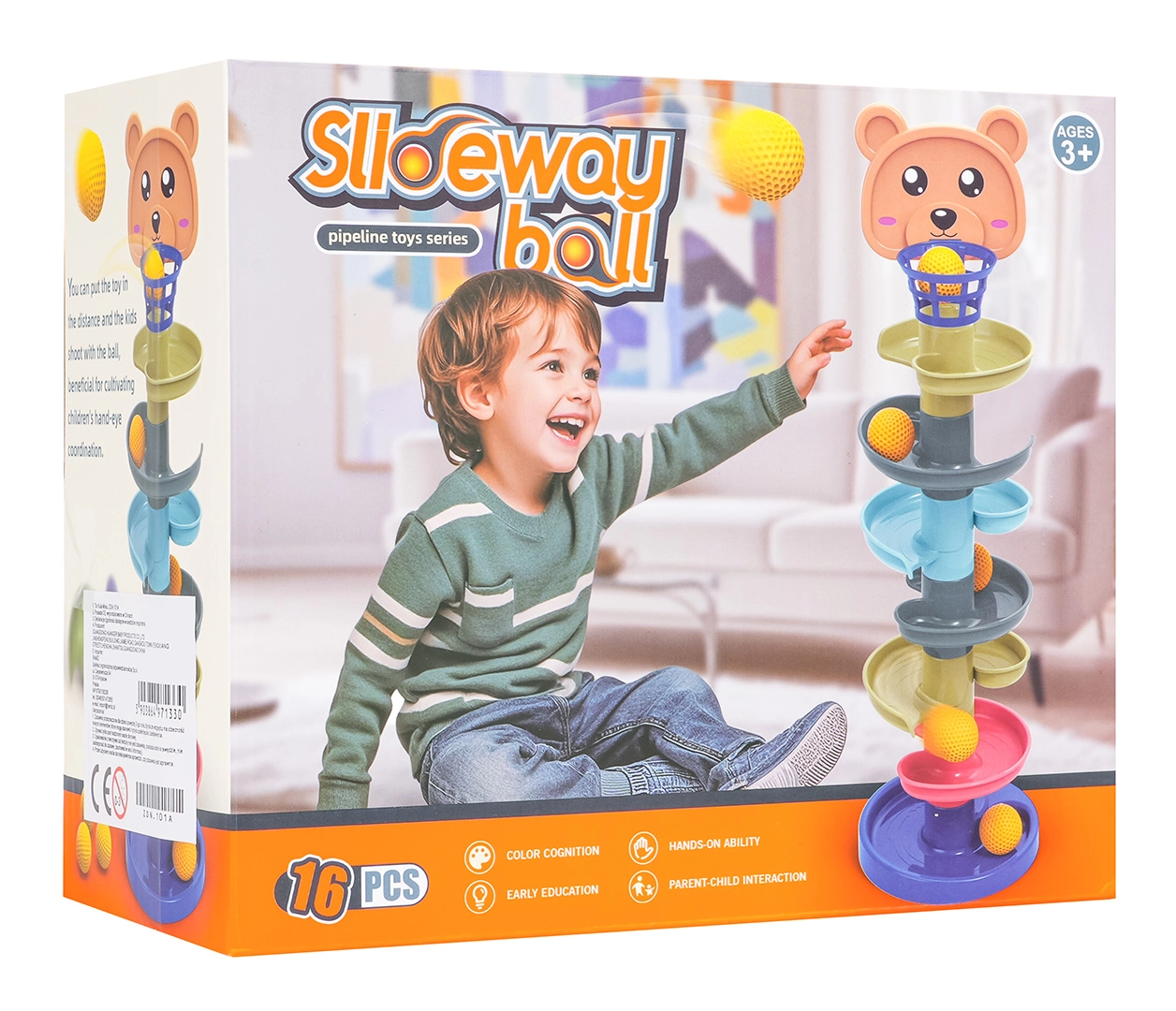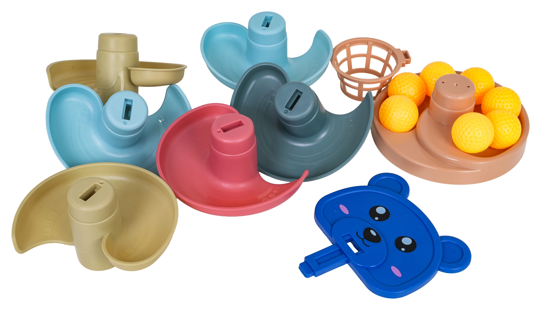 Zestaw zawiera 16 elementów, w tym stabilną podstawę, 6 pięter, główkę misia z koszyczkiem oraz 7 lekkich, teksturowanych piłeczek przyjemnych dla dziecięcej dłoni. Modułowy design pozwala dowolnie dostosowywać tor do wieku i umiejętności dziecka.