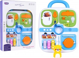 Kuferek wykonano z bezpiecznych, trwałych materiałów w żywych kolorach, a dzięki zintegrowanej rączce dzieci łatwo go przeniosą. W zestawie znajduje się także mini ksylofon (cymbałki) z pałeczką, który rozwija poczucie rytmu i percepcję słuchową. Świetne rozwiązanie do zabawy w domu i w podróży.