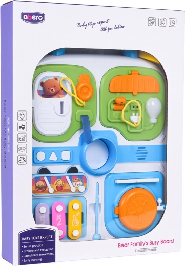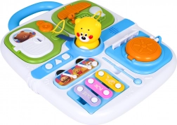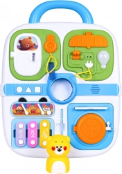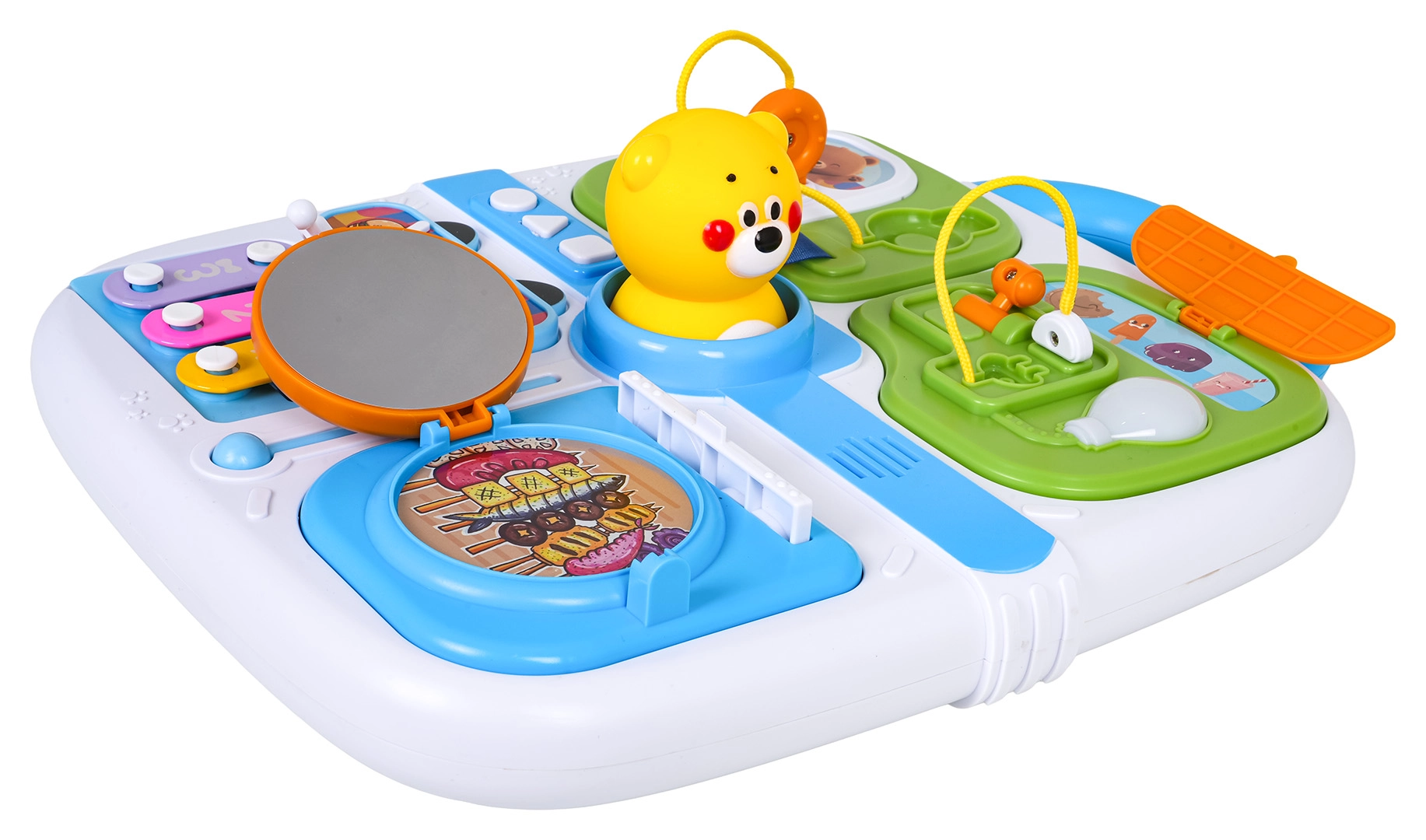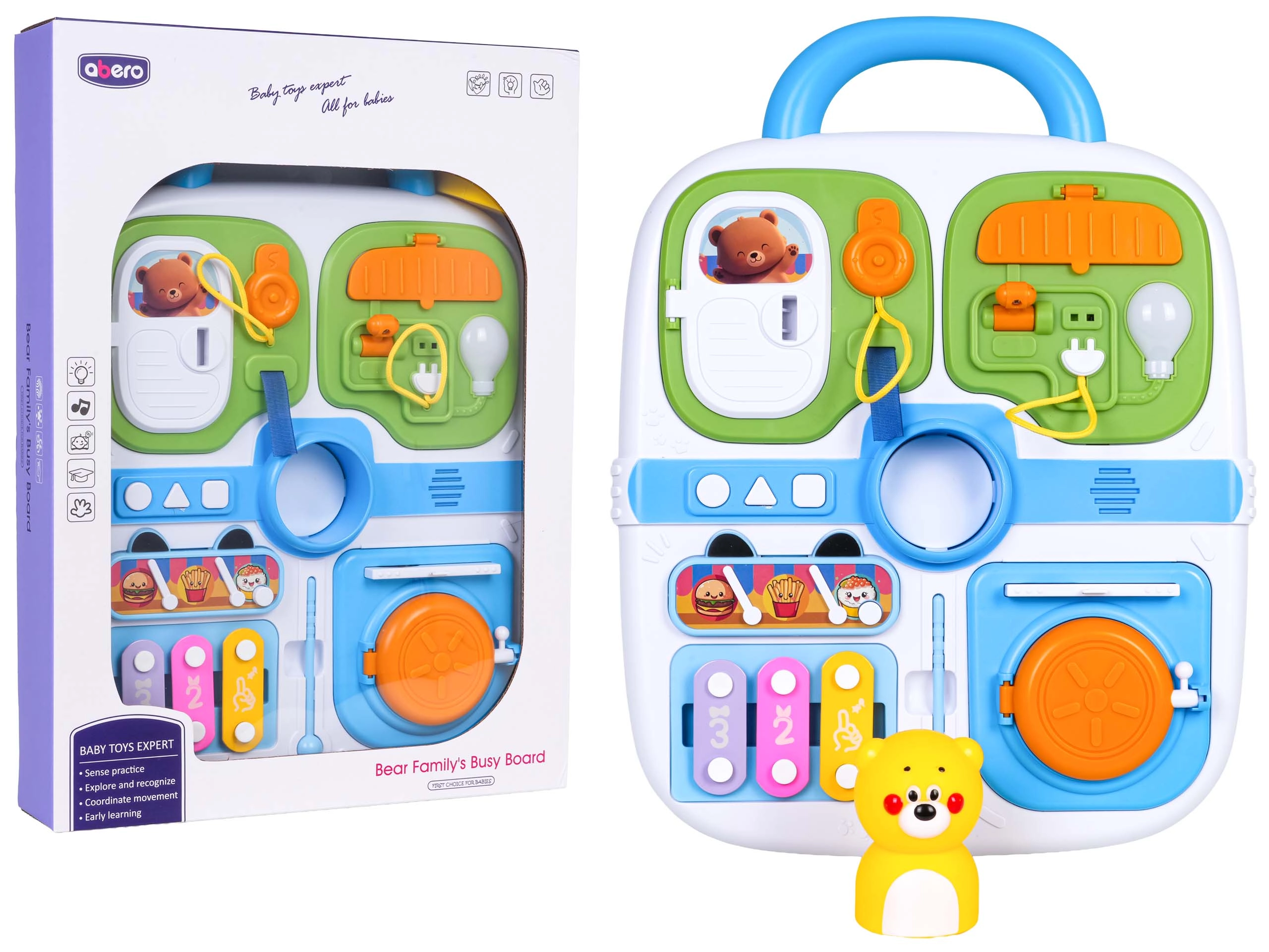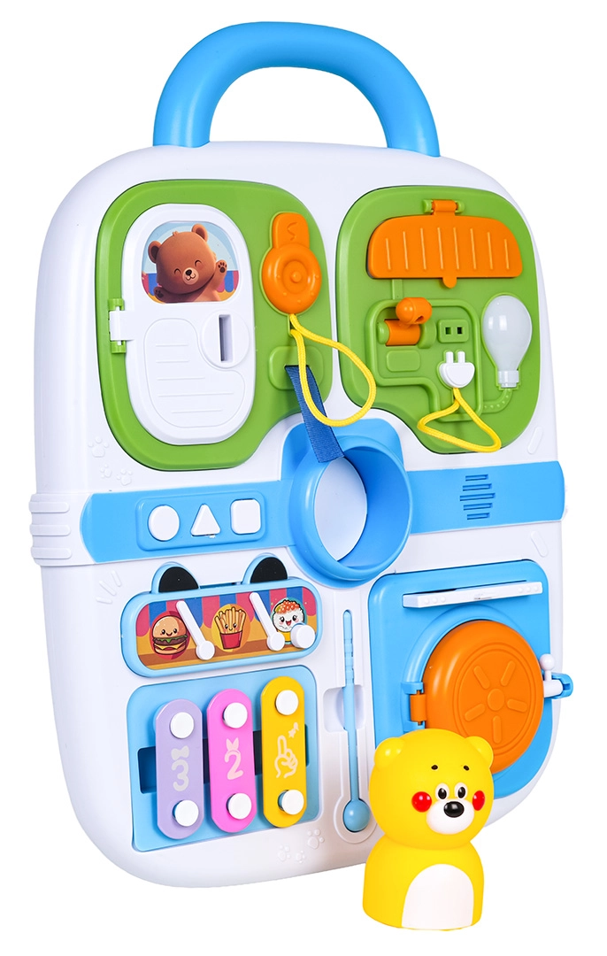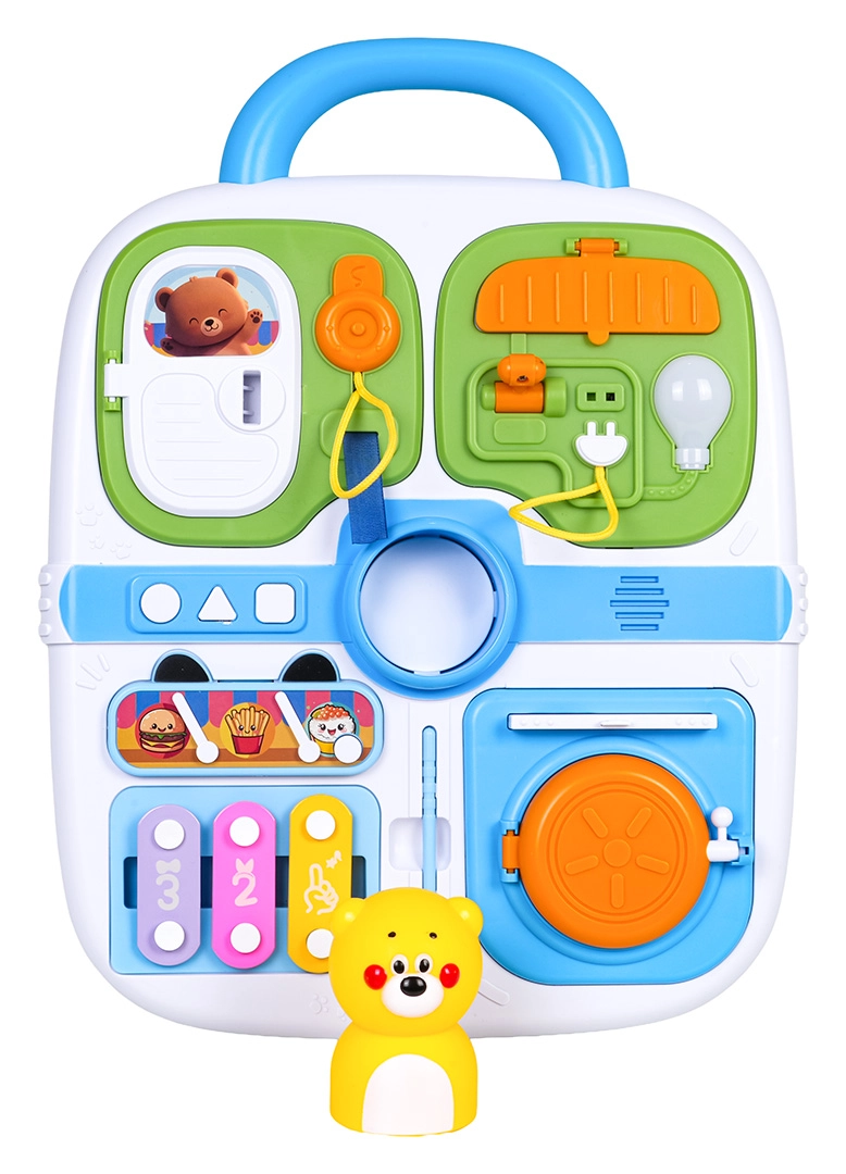 Odkryj zabawny wielofunkcyjny kufer manipulacyjny dla dzieci, który rozwija motorykę małą, logiczne myślenie i percepcję sensoryczną. Kolorowe interaktywne elementy zachęcają do otwierania, przesuwania i naciskania, nie brakuje też cymbałków z pałeczką, lampki świecącej po podłączeniu „wtyczki”, efektów dźwiękowych oraz praktycznego uchwytu do łatwego przenoszenia.