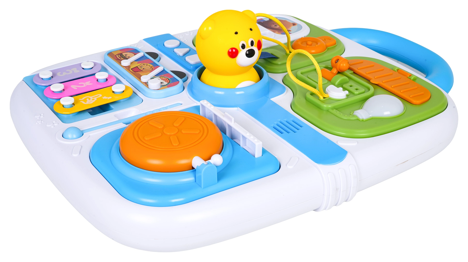 - otwieranie, przesuwanie, naciskanie, elementy obrotowe, drzwiczki na kluczyk, podłączenie wtyczki ze światłem, efekty dźwiękowe, piszczący miś, mini cymbałki z pałeczką