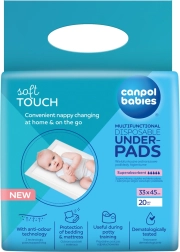 Praktyczne jednorazowe podkłady Canpol babies zapewniają czystą i higieniczną powierzchnię do przewijania w domu i w podróży. Mają superchłonny rdzeń, wodoodporną warstwę spodnią chroniącą przed przeciekaniem oraz miękką, delikatną powierzchnię przyjazną dla skóry dziecka. Dzięki technologii, która neutralizuje nieprzyjemne zapachy, otoczenie pozostaje świeże. Idealne do wózka, łóżeczka, na wizyty u lekarza oraz podczas nauki korzystania z nocnika. Opakowanie 20 szt., wymiary 33 × 45 cm.