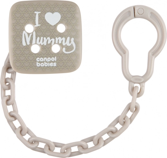 Utrzymuj smoczek zawsze pod ręką i w czystości. Łańcuszek do smoczka Canpol babies I LOVE MUMMY oferuje niezawodne mocowanie za pomocą solidnego klipsa, który łatwo obsłużysz jedną ręką. Minimalistyczny, szary design pasuje do każdego ubrania, a dzięki zaokrąglonym kształtom jest delikatny i bezpieczny.