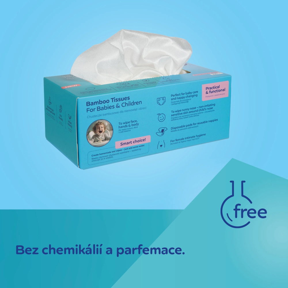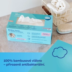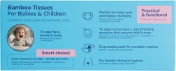 Ekstra delikatne i wytrzymałe bambusowe chusteczki dla niemowląt i dzieci. Wykonane w 100% z włókna bambusowego, które jest naturalnie antybakteryjne, bez chemii i substancji zapachowych oraz przyjazne dla środowiska. Odpowiednie od urodzenia, idealne do pielęgnacji, przewijania oraz jako domowe nawilżane chusteczki 2w1 – wystarczy dodać wodę.