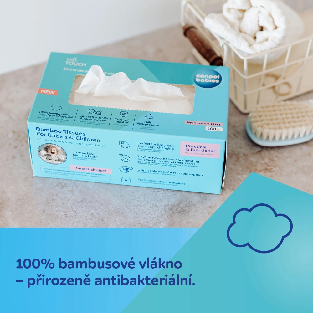 Bambusowe chusteczki CANPOL babies zostały zaprojektowane z myślą o wrażliwej skórze dziecka – są dermatologicznie testowane, miękkie, mocne i niebielone chlorem. Dzięki naturalnej bambusowej włókninie doskonale chłoną i są odporne na rozrywanie. Sprawdzą się w codziennej higienie, przy przewijaniu, do przecierania twarzy, rączek i nosa bez podrażnień.