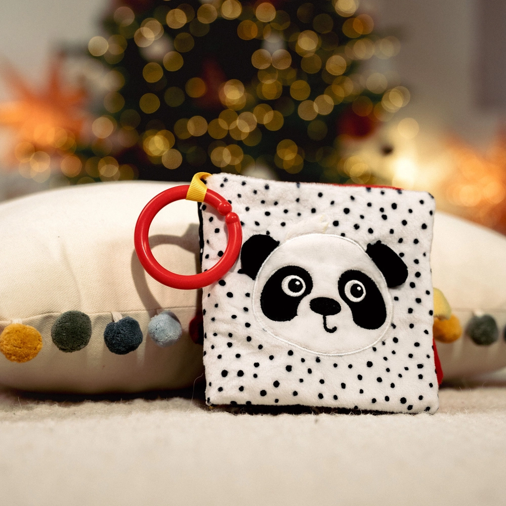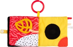 Teksturowany gryzak, szeleszczące strony i różnorodne materiały rozwijają dotyk i słuch oraz przynoszą ulgę podczas ząbkowania.