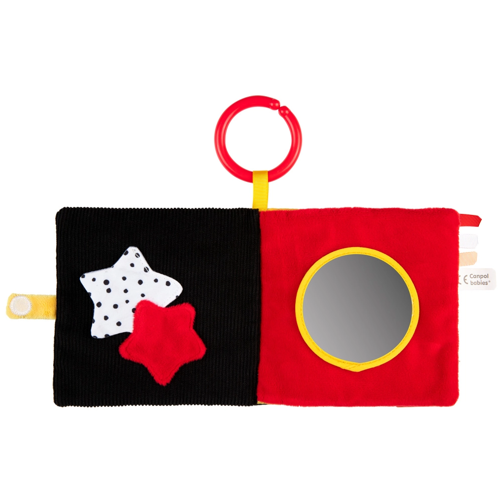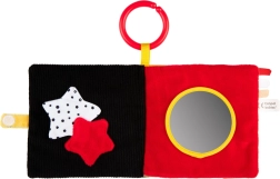 Wysoki kontrast czerni, bieli, czerwieni i żółci wraz z bezpiecznym lusterkiem przyciąga uwagę niemowlęcia i wspiera rozwój wzroku od pierwszych dni.