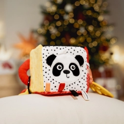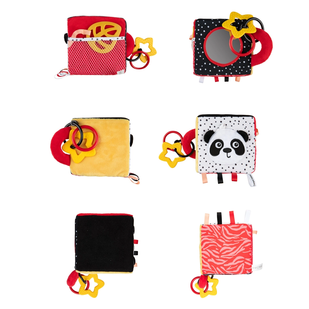 Kostka sensoryczna BabiesBoo jest lekka, miękka i idealna do małych dziecięcych rączek. Kontrastowe czarno-białe i kolorowe wzory stymulują wzrok, szeleszczące materiały oraz delikatnie dzwoniąca grzechotka rozwijają słuch, a różnorodne faktury z pętelkami pobudzają wrażenia dotykowe. Bezpieczne lusterko wspiera samopoznanie i koordynację ręka–oko.