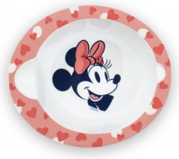 Praktyczny dziecięcy zestaw do kuchenki mikrofalowej z miseczką i łyżeczką w designie DISNEY Minnie dla dzieci od 10 miesięcy. Miseczkę można podgrzewać w mikrofalówce, materiał jest wolny od BPA, a cały zestaw jest lekki i łatwy w użyciu na co dzień.