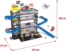 Ten duży parking z lądowiskiem dla helikopterów to świetne centrum zabawy dla wszystkich małych kierowców. Dzięki czterem poziomom oferuje mnóstwo miejsca do parkowania i kreatywnej zabawy, a lądowisko dodaje kolejny wymiar frajdy. W opakowaniu znajdziesz także 3 autka i 1 helikopter, więc możesz zacząć jeździć i latać od razu po złożeniu.