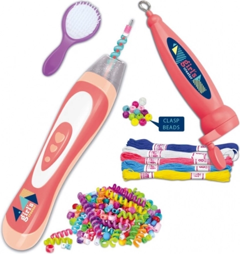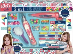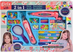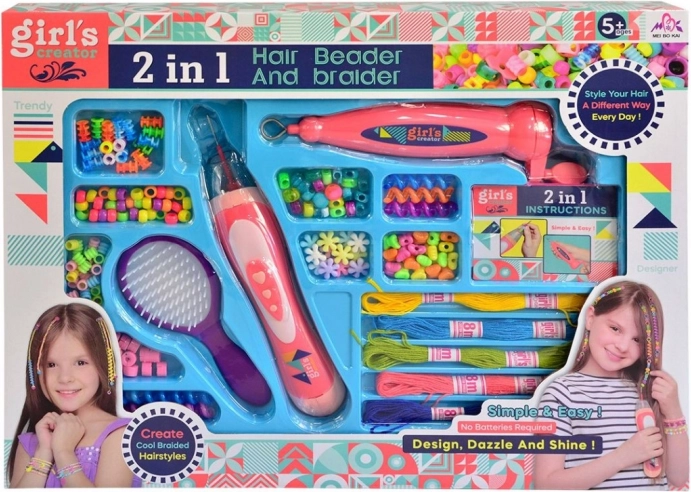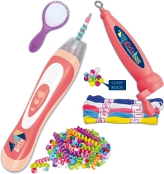 Kreatywny zestaw dla małych stylistek umożliwia tworzenie kolorowych fryzur za pomocą koralików, nitek i zaplatarki. Wystarczy nawlec koraliki, połączyć kolory i w kilka chwil stworzyć oryginalne ozdoby do włosów. Zestaw zawiera zaplatarkę, nawlekacz, grzebień oraz bogaty wybór koralików i jest odpowiedni dla dzieci od 3 lat.