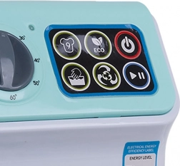 Dzieci pokochają panel z przyciskami, obrotowy wybierak temperatury oraz funkcję start/stop. Sterowanie jest intuicyjne i przypomina prawdziwą pralkę.