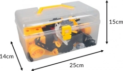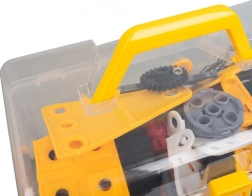 Ten zestaw dla małych konstruktorów zawiera bogaty komplet interaktywnych elementów, w tym koła, zębatki, śrubki i narzędzia, dzięki którym dzieci zbudują różne jeżdżące pojazdy i proste modele mechaniczne. Wszystko jest przejrzyście schowane w solidnym pudełku z uchwytem, więc zestaw łatwo przenosić i przechowywać.