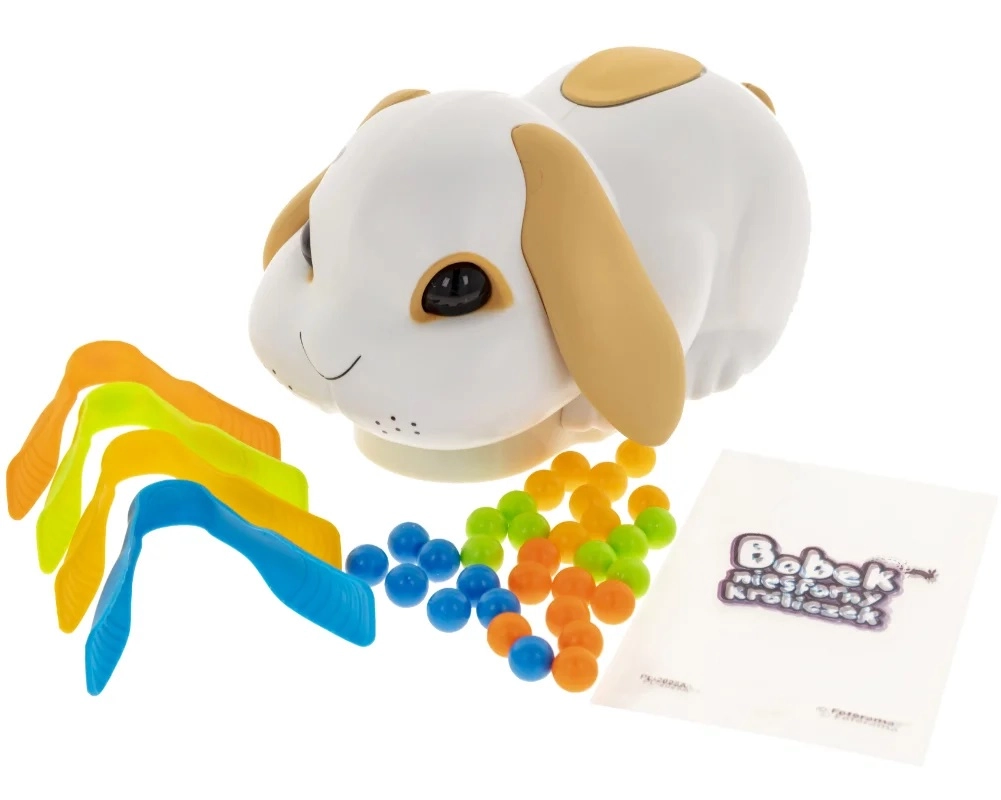 1 elektroniczny króliczek, 32 kulki w czterech kolorach, 4 pęsety, 4 woreczki, instrukcja
