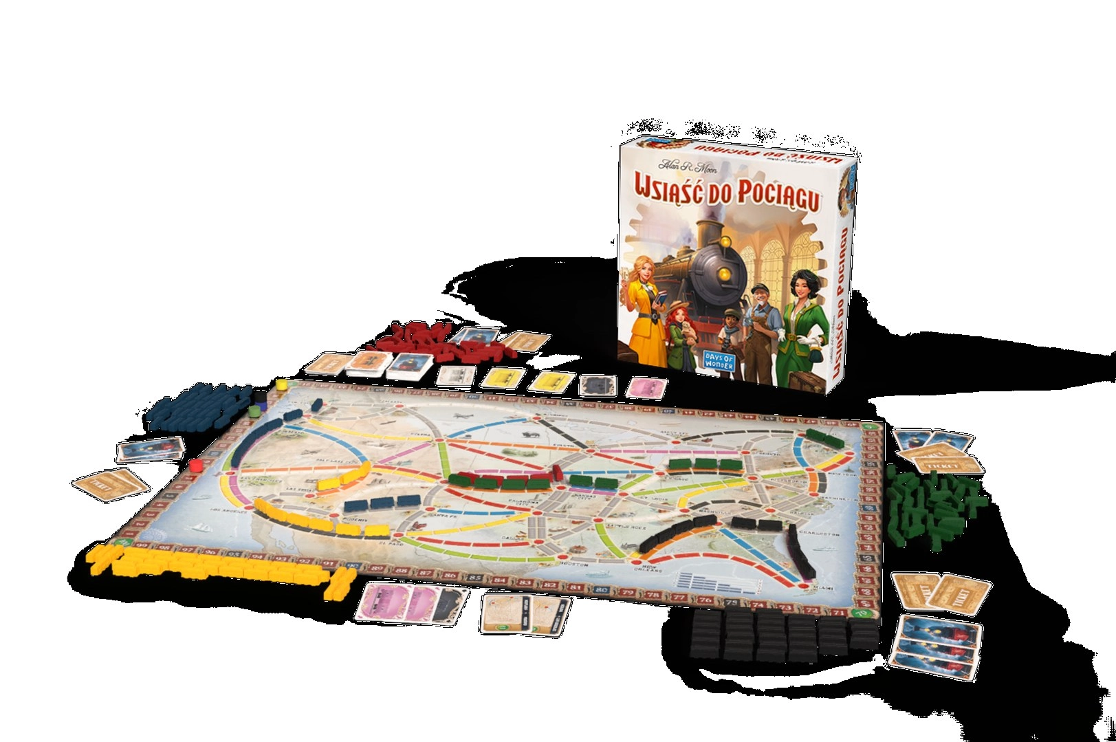 - Plansza z mapą Ameryki Północnej; 240 kolorowych wagoników; 110 kart wagonów; 33 karty biletów; karta premii za najdłuższą trasę; 5 znaczników punktacji; instrukcja