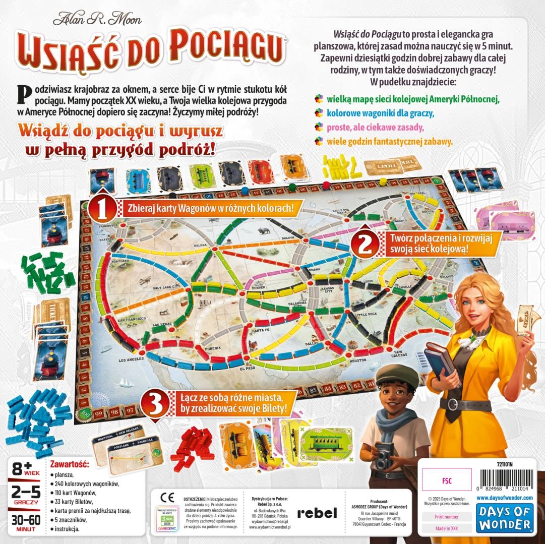 Wyrusz w pełną przygód podróż po Ameryce Północnej z rodzinną grą planszową Wsiąść do Pociągu. Zbieraj kolorowe karty wagonów, buduj linie kolejowe między miastami i realizuj tajne zadania, aby zdobyć jak najwięcej punktów. To wydanie oferuje zaktualizowane komponenty i ulepszony design, proste zasady oraz wysoką regrywalność dla dzieci i dorosłych.