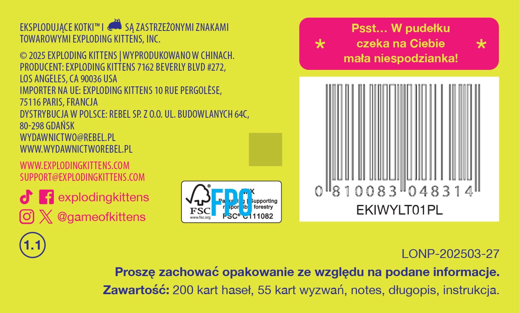 - 200 kart z hasłami, 55 kart wyzwań, notes, długopis, zasady