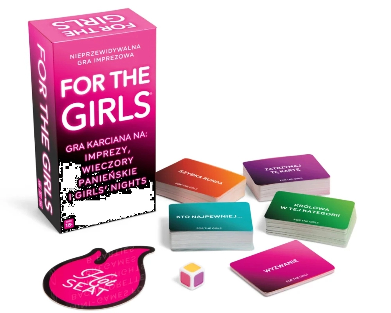 For the Girls to bezkompromisowa gra towarzyska zaprojektowana wyłącznie dla kobiet. Mieszanka kart z wyzwaniami, pytaniami i głosowaniami rozkręci każdy wieczór — od panieńskich po luźne spotkania z przyjaciółkami. Kolor wyrzucony na kostce określa kategorię, różowy uruchamia Gorące krzesło, a czarny pozwala wybrać dowolną kartę. Wygrywa ta, która jako pierwsza zbierze 10 kart… albo gra kończy się, gdy przyjeżdża taksówka.