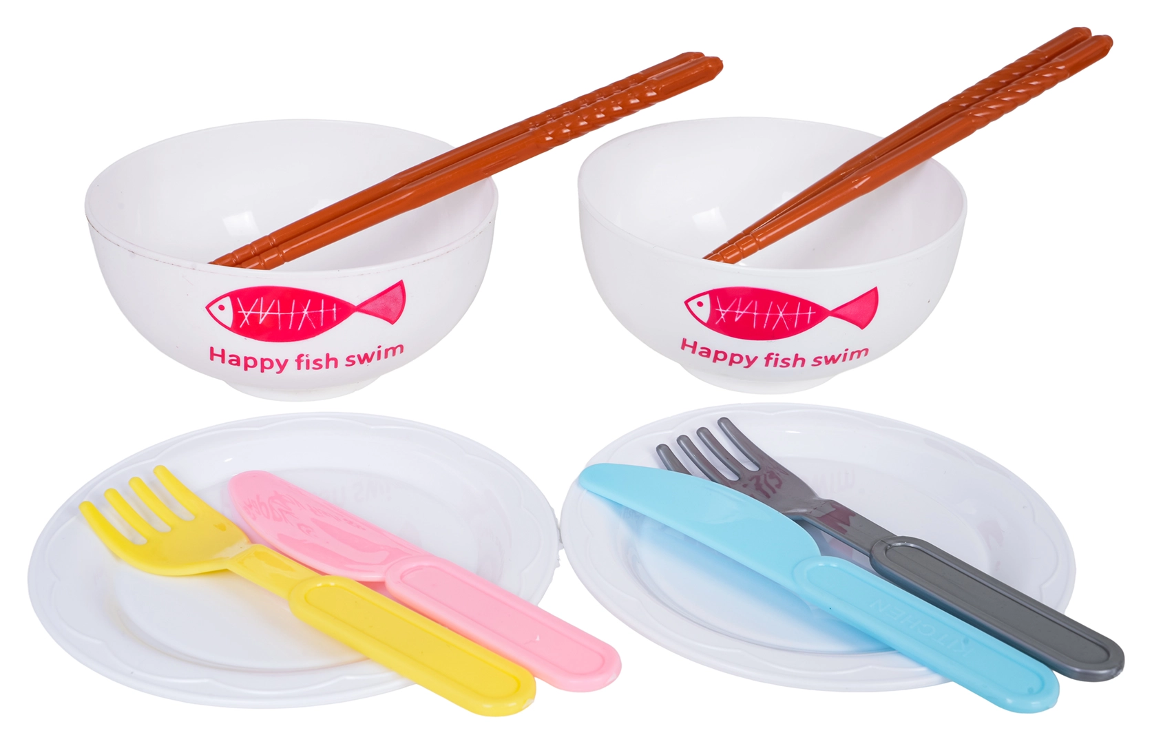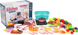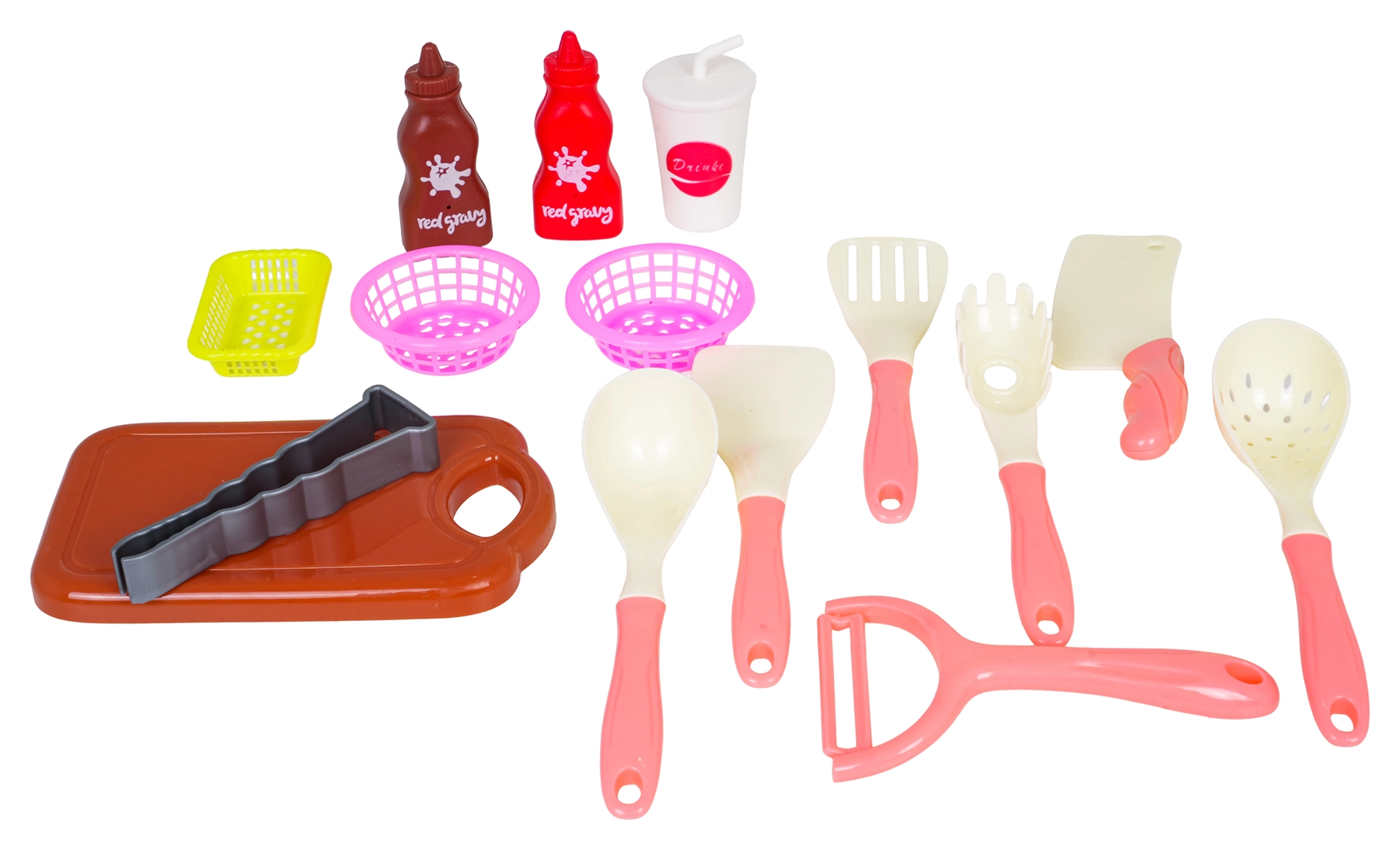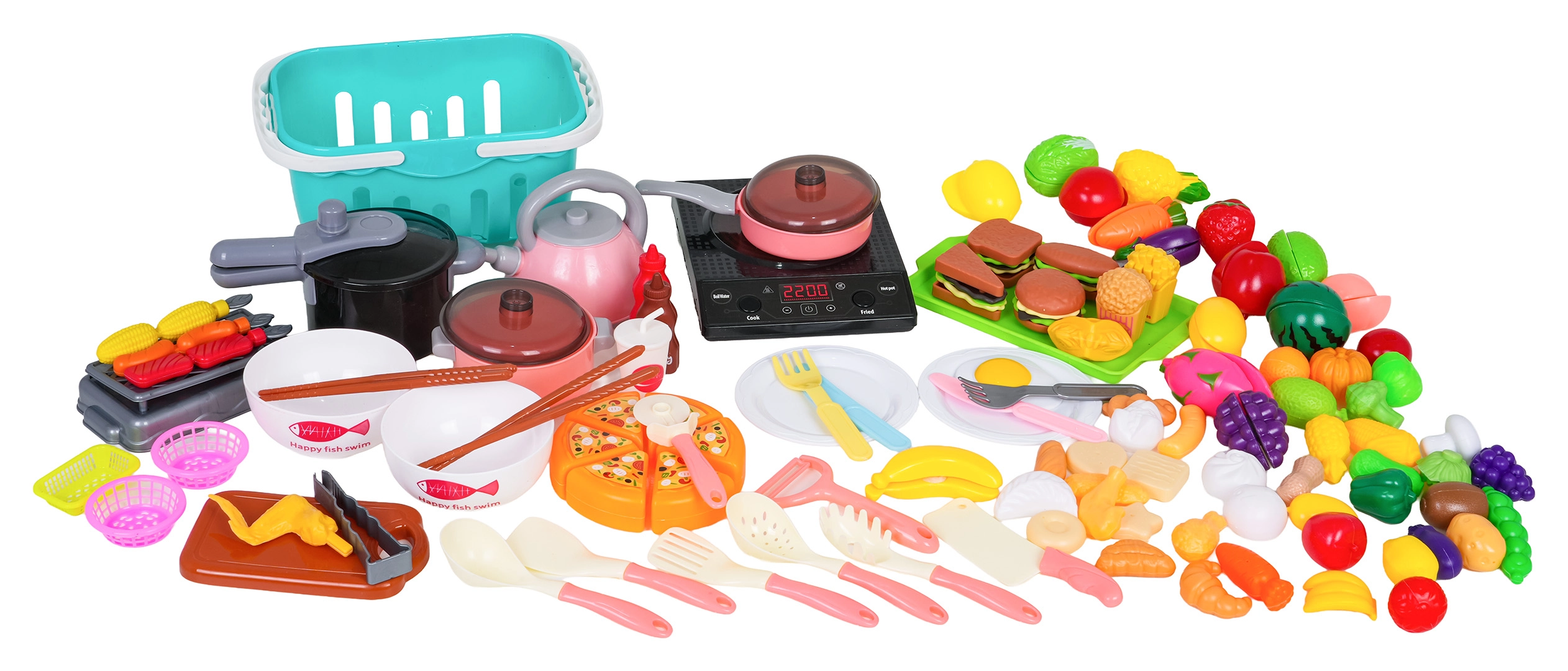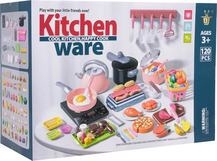 W zestawie znajduje się płyta indukcyjna na 3× AA (brak w zestawie), która wyświetla temperaturę i ma dotykowe sterowanie; nie brakuje grilla, zestawu naczyń (zabawkowy czajnik elektryczny, szybkowar, patelnia, garnek), zestawów do serwowania (miski, talerze, sztućce, pałeczki), produkty do krojenia na rzepy, pizza z radełkiem, szaszłyki i wiele więcej. Całość uzupełnia koszyk na zakupy oraz taca do serwowania dla realistycznej zabawy.