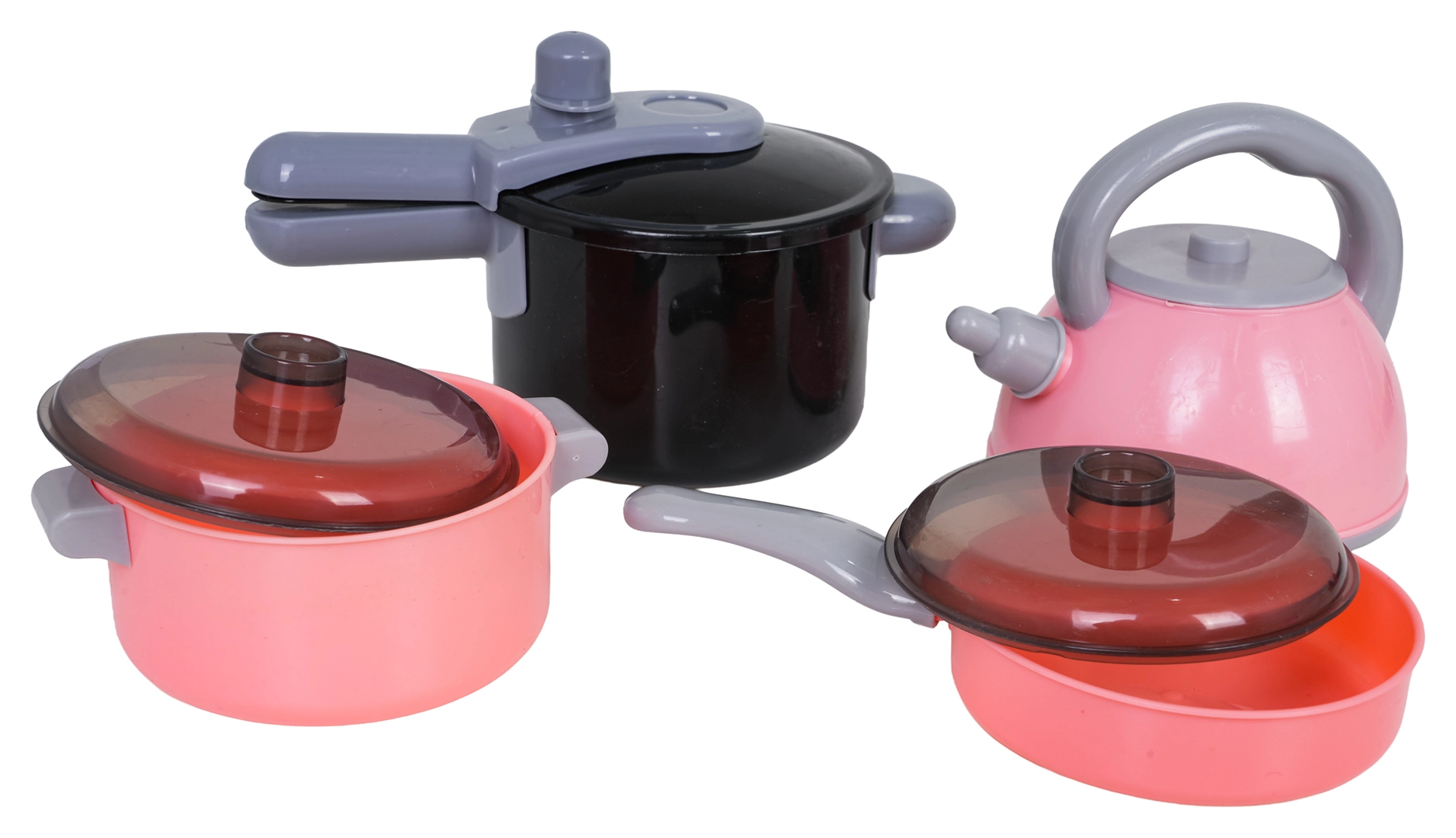 Garnek, patelnia z pokrywką, szybkowar i czajnik uzupełnia kompaktowy grill. Dzieci mogą gotować, dusić i grillować ulubione „potrawy”.
