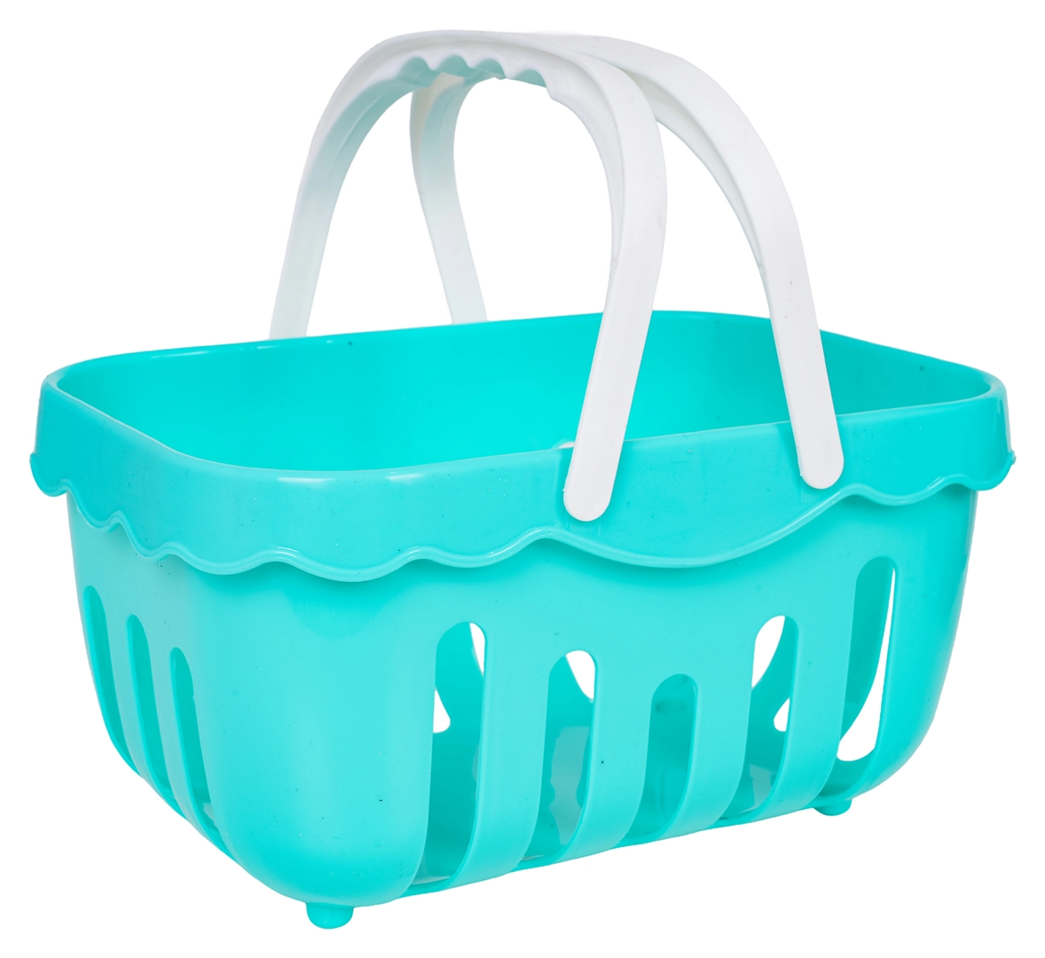 Duży koszyk na zakupy i barwny zestaw owoców oraz warzyw, w tym elementów na rzepy, uczą rozpoznawania produktów i trenują małą motorykę podczas krojenia.