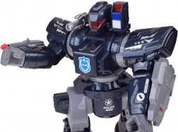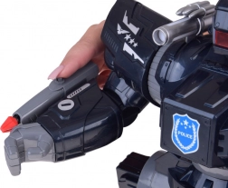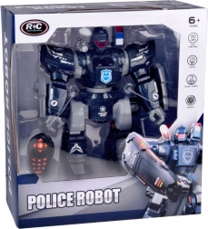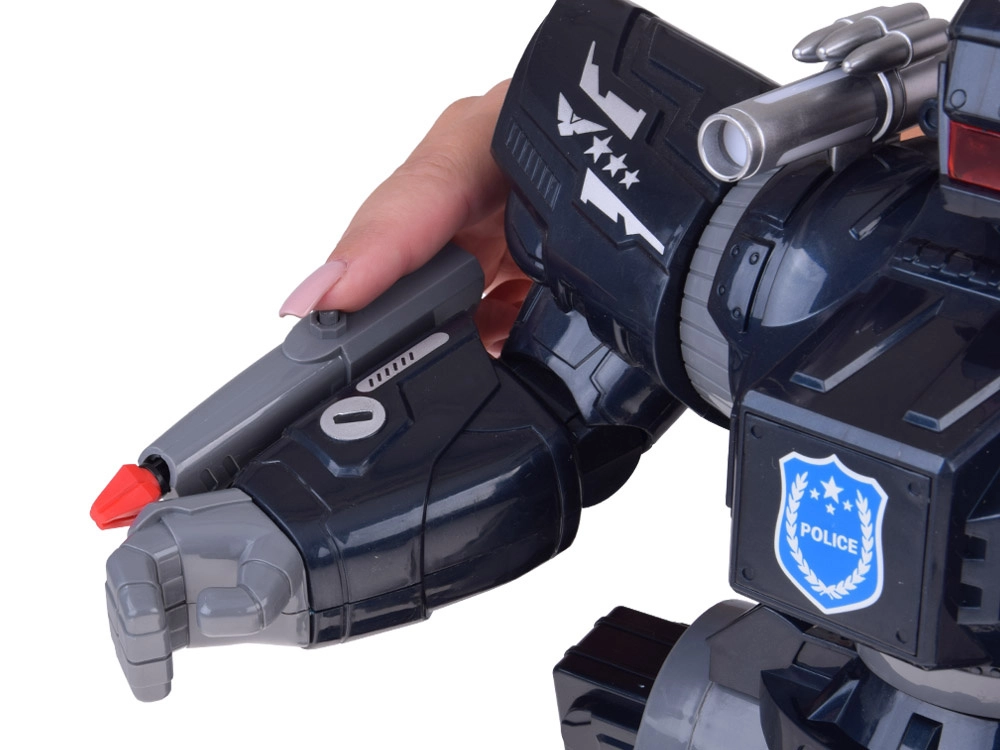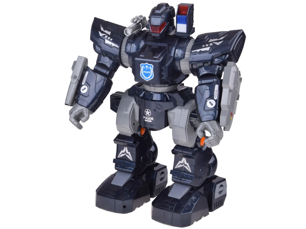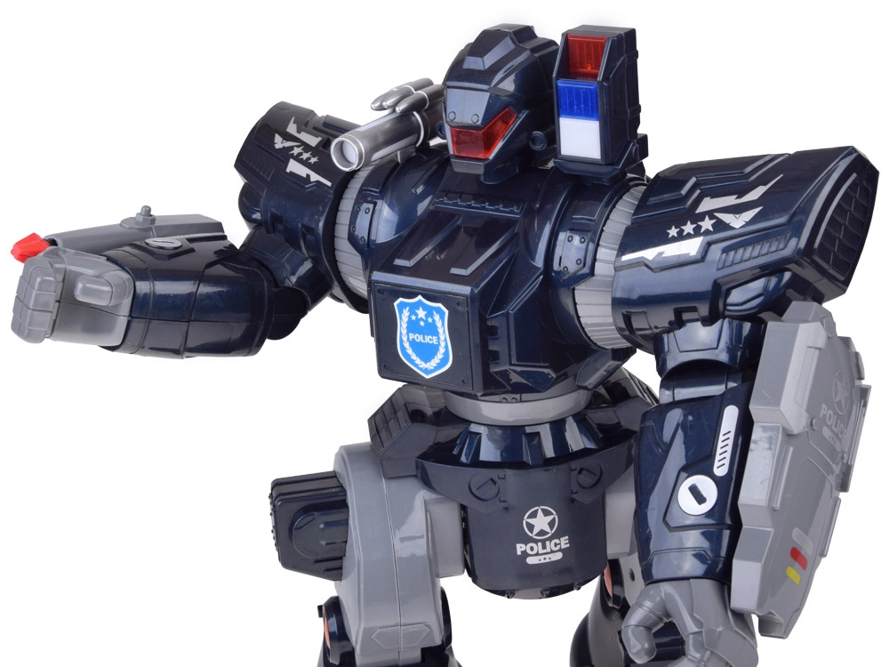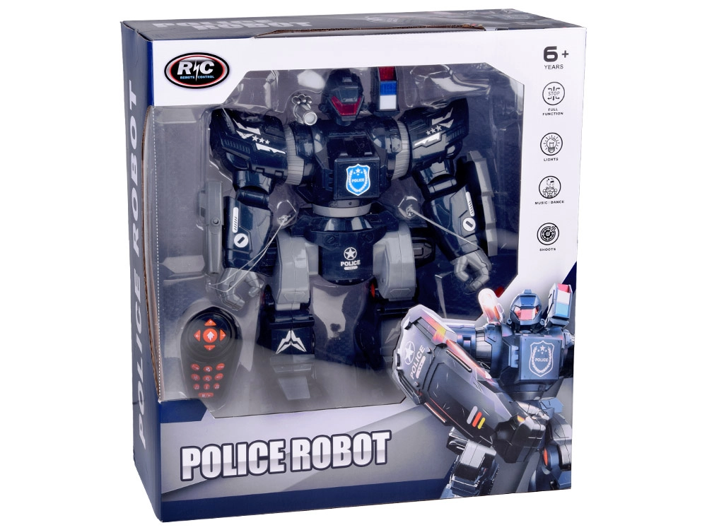 Interaktywny policyjny robot zdalnie sterowany zapewnia dzieciom dynamiczną zabawę. Potrafi się poruszać, obracać, tańczyć do melodii, ma efekty świetlne, efekty dźwiękowe oraz strzela miękkimi pociskami. Dzięki dużym wymiarom ok. 38 × 30 × 16 cm, regulacji głośności i trybowi demo to doskonały prezent dla małych fanów policji i robotów.