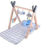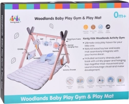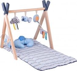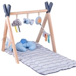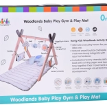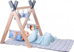 Stylowa drewniana baby gym oferuje maluszkowi komfortową przestrzeń zarówno na brzuszku, jak i na plecach, a miękkie wiszące zabawki zachęcają do sięgania, chwytania i odkrywania różnych faktur. Kontrastowe elementy, szeleszczące materiały i piszczałki naturalnie stymulują wzrok, słuch i dotyk.