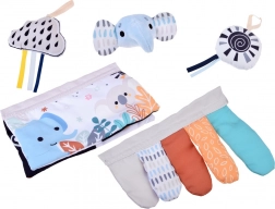 W zestawie znajduje się miękko wyściełana mata edukacyjna, praktyczna poduszka w kształcie litery U – słonik dla wygodnego podparcia oraz kolorowy zestaw zabawek o zróżnicowanych powierzchniach. Dzięki łatwemu montażowi i lekkiej konstrukcji pałąk można szybko złożyć i zabrać w podróż.