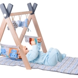 Stabilna rama w kształcie litery A z naturalnego drewna z kilkoma punktami mocowania zabawek zapewnia solidne i bezpieczne warunki do codziennej zabawy w domu i w podróży.