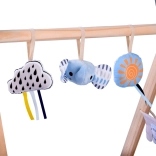 Miękkie wiszące zabawki – chmurka z wstążeczkami, słoneczko i słonik – wspierają rozwój wzroku, koordynację ręka–oko oraz pierwsze chwyty.