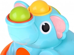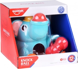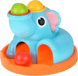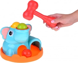 Uroczy słonik na stabilnej podstawie przyciąga dzieci żywymi kolorami i zaokrąglonymi kształtami. W zestawie znajduje się czerwony młoteczek i trzy kolorowe kulki (czerwona, żółta, zielona), które wkłada się i wbija w otwory – kulki następnie przetaczają się przez zabawkę i wypadają na zewnątrz, co zachęca do kolejnych prób i wspiera naukę relacji przyczyna–skutek.