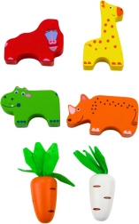 drewniane auto z zdejmowanym dachem, 6 marchewek (ok. 8 cm), 8 magnetycznych robaczków (ok. 5,5 cm), 2 figurki z magnesem (ok. 6,5 cm), 6 zwierzątek do sortera
