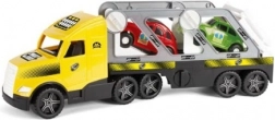 Magic Truck Action Retro to świetny wybór dla małych miłośników aut i wyścigów. Duży ciągnik z realistycznymi detalami i długą platformą naczepy pozwala na wiele scenariuszy zabawy – od transportu klasyków po wsparcie serwisowe podczas wyścigów. Naczepę można podłączyć na dwa sposoby, jest skrętna i wyposażona w wysuwane podpory, dzięki czemu może stać samodzielnie.